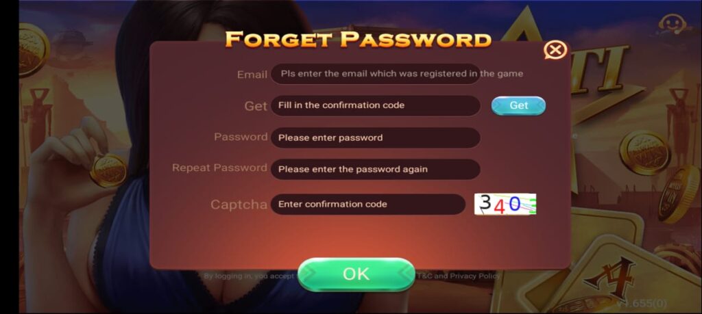 To begin the process, open the app and enter the email address that is registered with your 3 Patti No 1 account. After entering your email, tap on the Get button. A confirmation code will be sent to your email address.